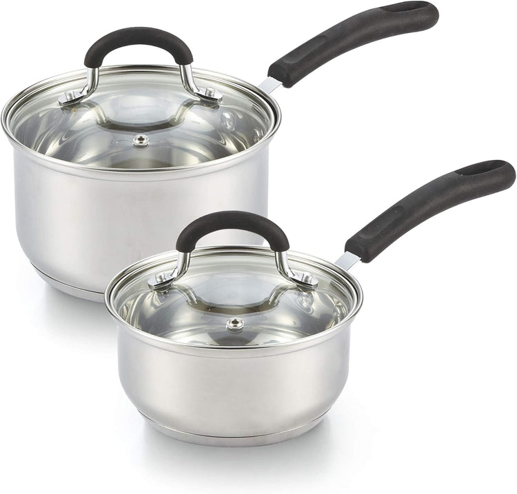 Cook N Home 1 & 2 Quart Stainless Steel Saucepan Sets with Lid, Induction Compatible Milk Pots, Stay-Cool Silicone Handle, Mirror Polished 18/10 Cookware, Dishwasher & Oven Safe, Silver